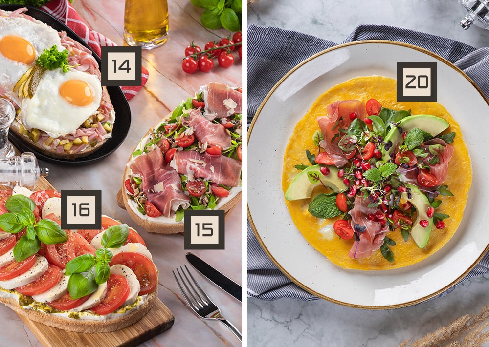Omelett mit Parmaschinken, Avocado, frischen Kräutern, Kirschtomaten und Granatapfelkernen